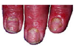 Along with the common symptoms of inflamed, scaly, shiny skin, psoriatic arthritis causes pitted, discolored nails and the swollen, painful joints that are typical of arthritis. It can also lead to inflammatory eye conditions such as conjunctivitis. Although the disease usually isn't as crippling as other forms of arthritis, it may cause stiffness and progressive joint damage and in the most serious cases may lead to permanent deformity. Adults in their 30s, 40s and 50s are most often affected, but children also can develop a form of the disease.